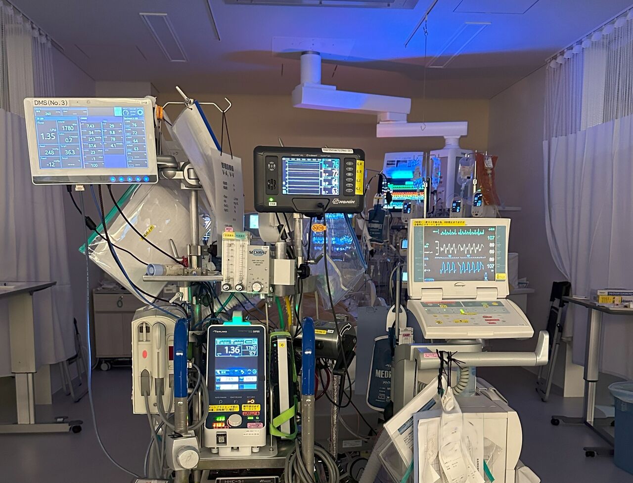 ECMOやIMPELLA・IABP・CHDF・TTM・脳波etc..高度な治療に必要であるME機器を他施設と比較しても非常に多く管理しており、医師・看護師・臨床工学技士など、多職種で連携しながら、全身管理を行っています。