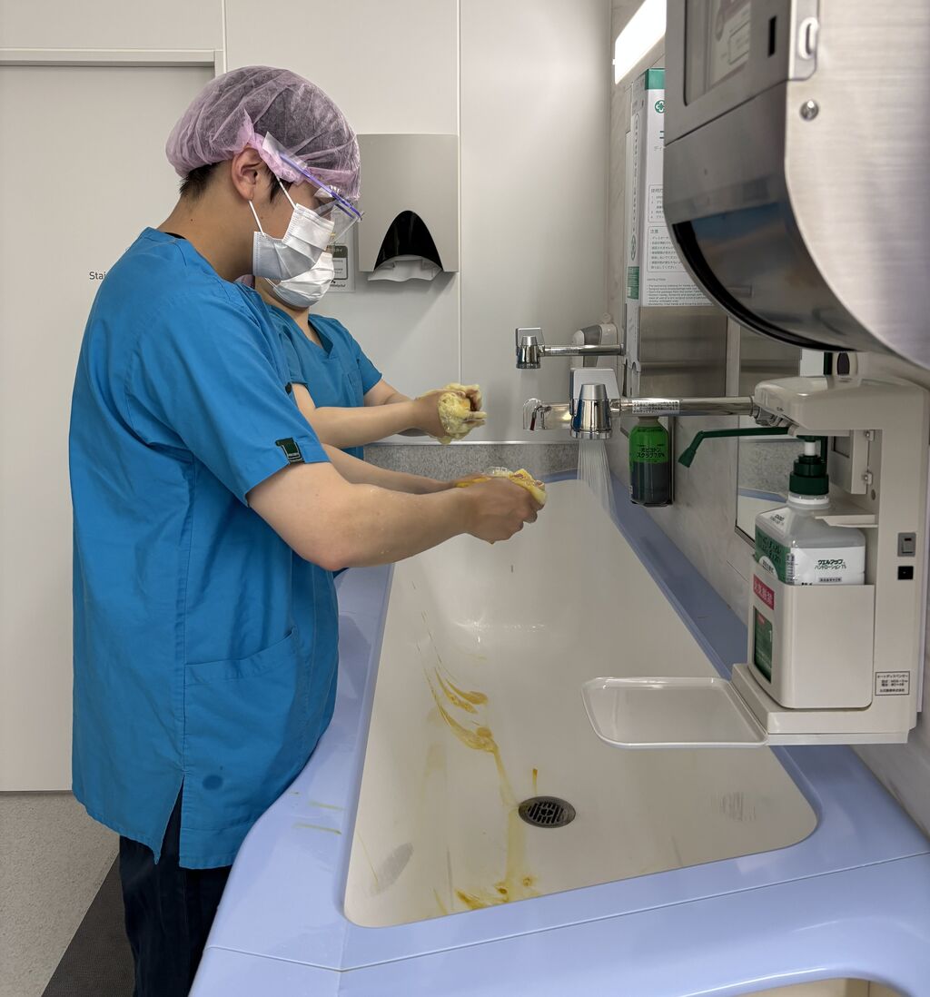 学生の時に手術に必須な手術時手洗いやガウンテクニックなど実践する機会が少ないため、練習が必要です。慣れない環境ながらもみんな真剣に取り組んでいます!