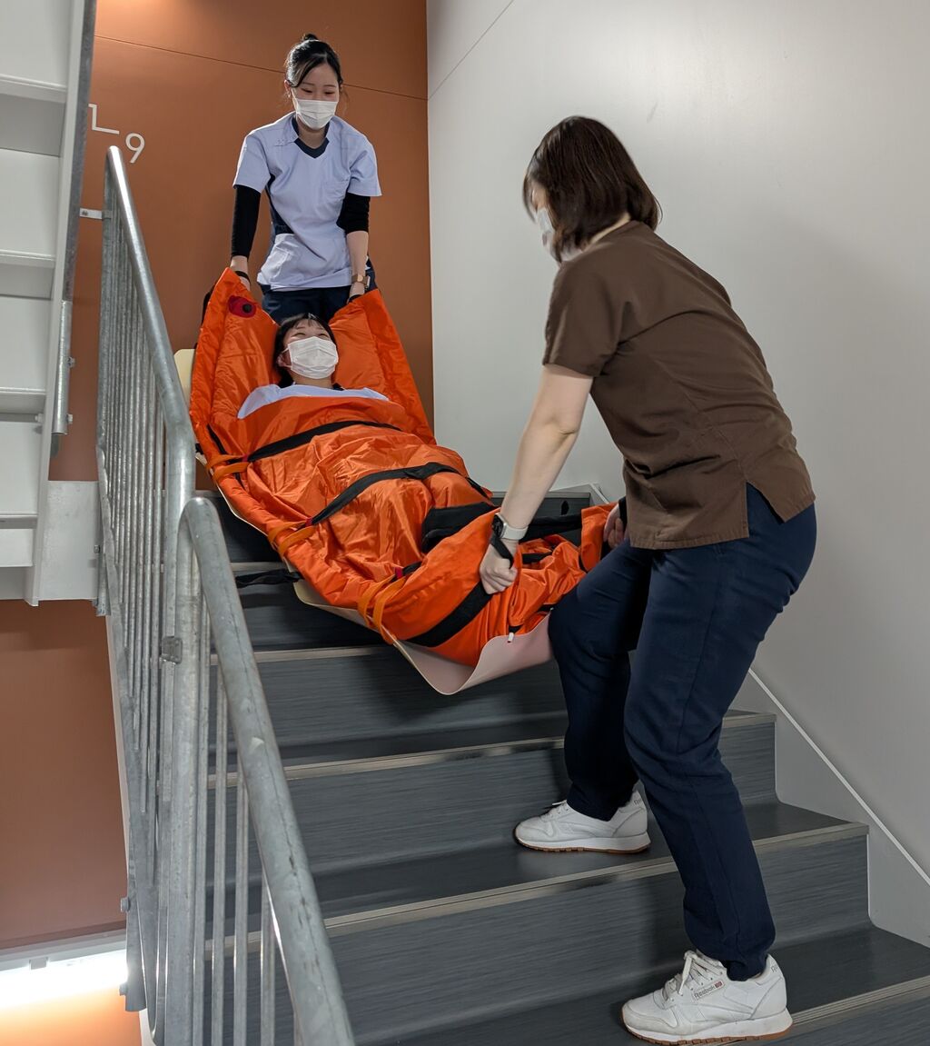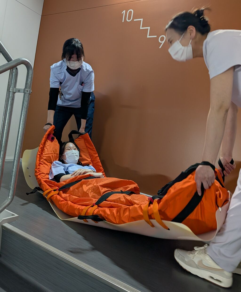 災害時に使用する避難経路の確認やエアーストレッチャーの使い方を座学で学習した後、看護師役や患者役になりエアーストレッチャーを使用し避難の体験をすることができました。