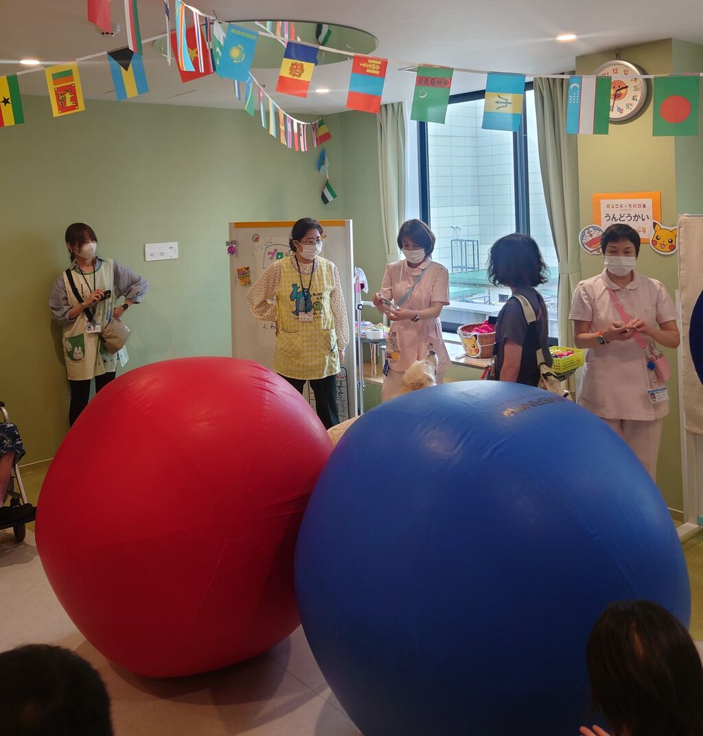今年は病院の建て替え工事のため、中庭広場ではなくプレイルームでの開催となりました。カラフルな旗がプレイルームを彩り、こども達の目もキラキラ★