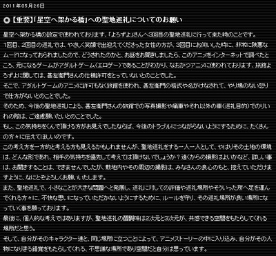 | http://minkara.carview.co.jp/userid/875874/blog/22566417/ アニメ「星空へ架かる橋」に登場する主人公の住まい“旅館・よろずよ”のモデルになった“民宿・甚左衛門”が「勝手にアニメに使用された」として聖地巡礼を目的とした来訪を禁止したと言う話題。 「ストライクウィッチーズ」にてエイラ・イルマタル・ユーティライネン少尉役でブレイクした大橋歩夕(旧・仲井絵里香)さんが出演する作品として、ウチのビューワーさんでも注目されている方が多いでしょう。 私もその一人で毎週楽しみにしており、夏には“旅館・よろずよ”に聖地巡礼しようと“民宿・甚左衛門”の宿泊の計画を立てておりました。 そんな矢先の寝耳に水に、「決して誰にも迷惑をかけませんから、どうか巡礼目的の宿泊と撮影を許可して頂けないでしょうか?」と本日の昼ごろ電話でお伺いをたてたのですが・・・。 問題になったブログの内容は事実と大幅に違う。 主人が言われた禁止事項はただひとつ。 宿泊しない観光客の方の 敷地内への立ち入りと撮影をお断りしています。 これだけ・・・いやそれって常識ちゃうん? そうなんですよ。 このアホの痛車ブロガーは泊まりもせんと厚かましく敷地内で撮影しに来るので、3回目にやんわりと旅館側が断っただけ。 宿泊客ならば巡礼も撮影も問題なし。 宿泊しない観光客でも外回りの撮影までならOK。 至極当たり前の対応です。問題はこのアホブロガーだけ。 | ||