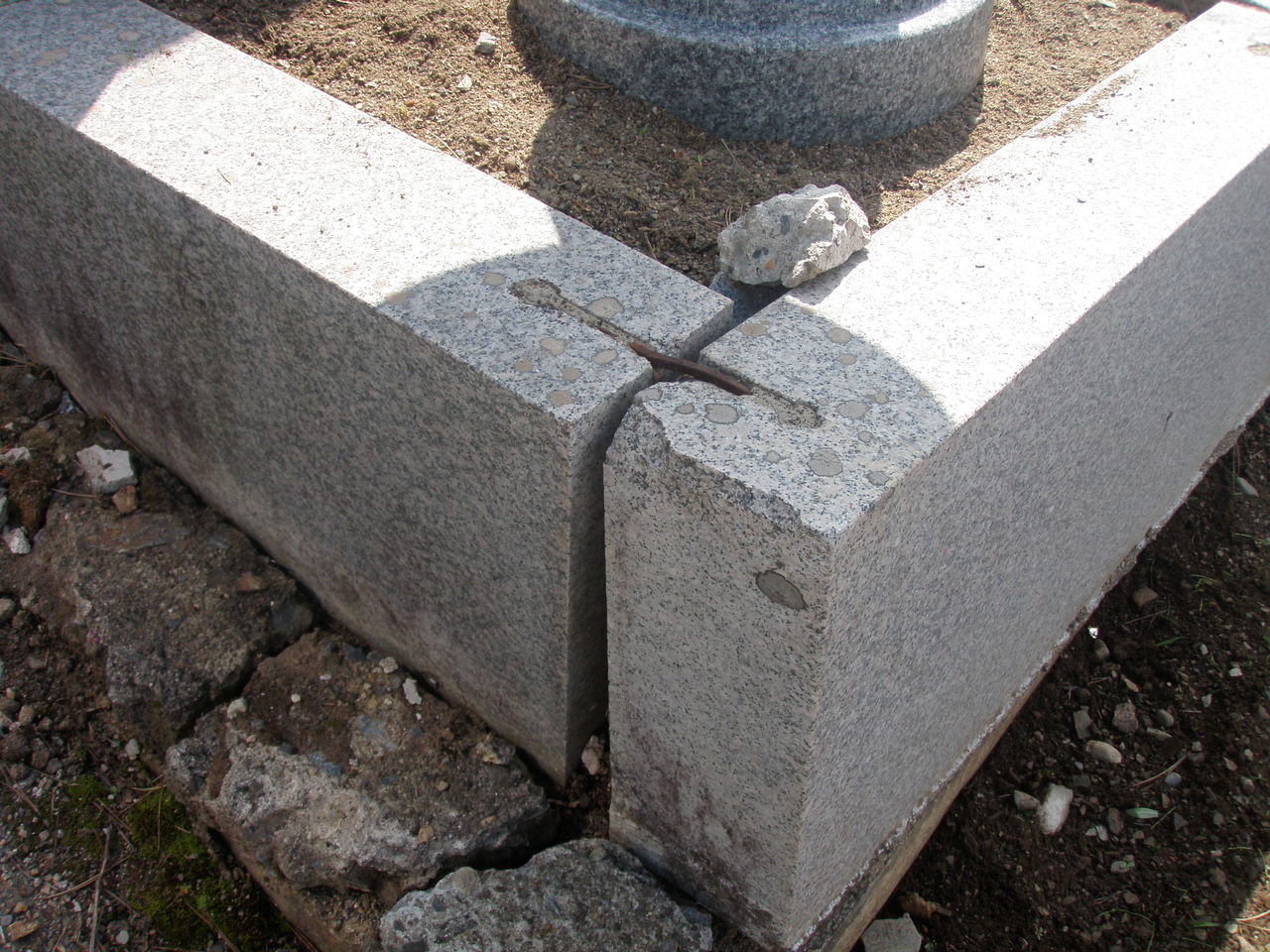 「石塔にひび割れ、角カケがある」