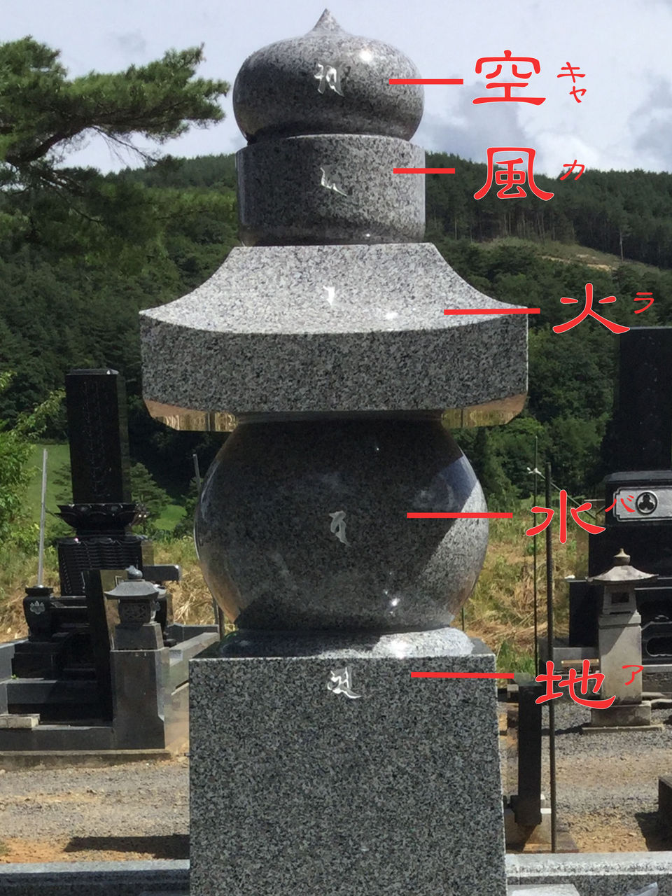 それぞれの形は頭頂(宝珠)、顔(半月)、胸(三角)、腹(円)、足(四角)を象徴され