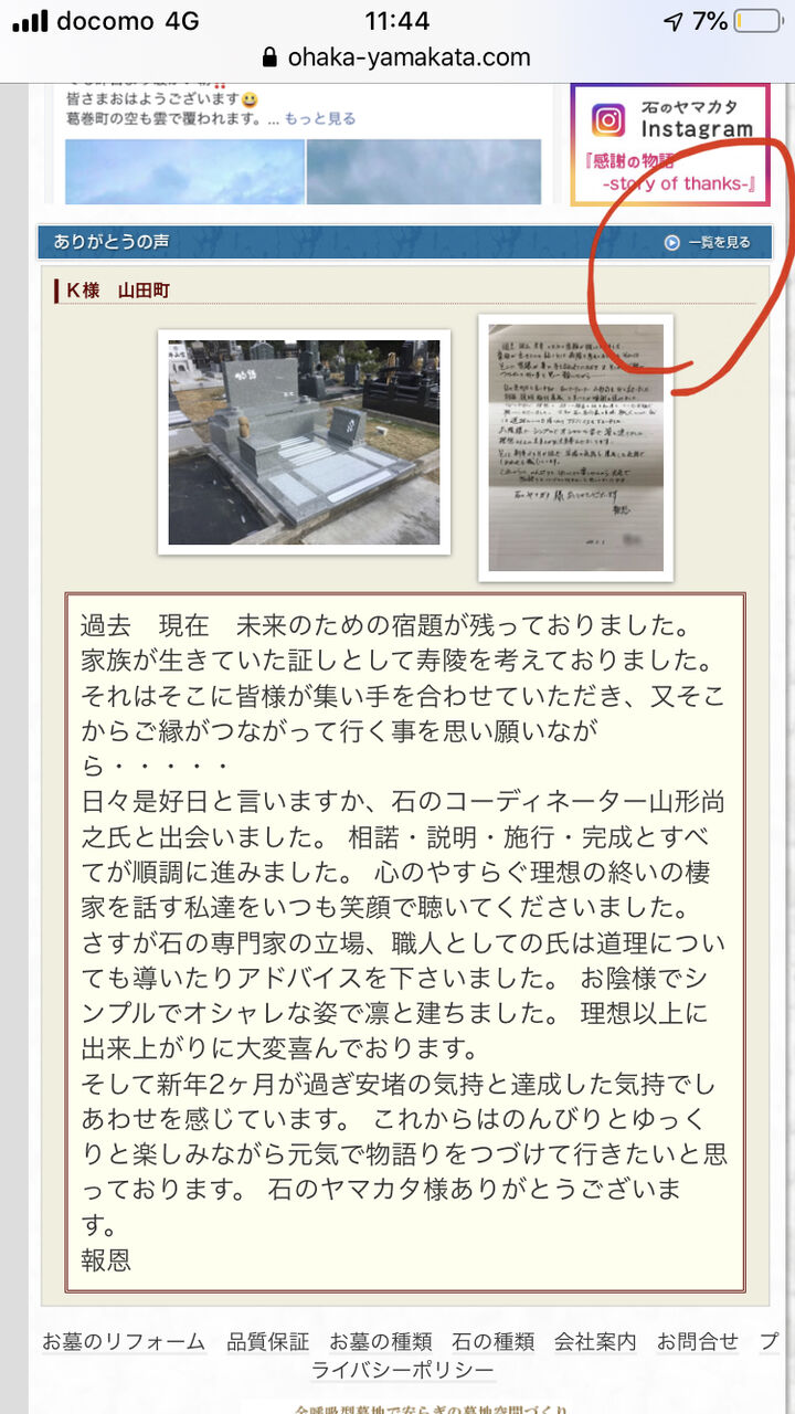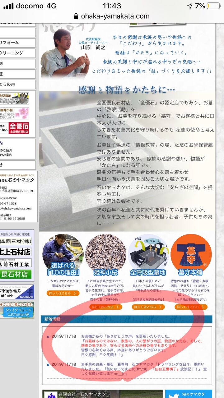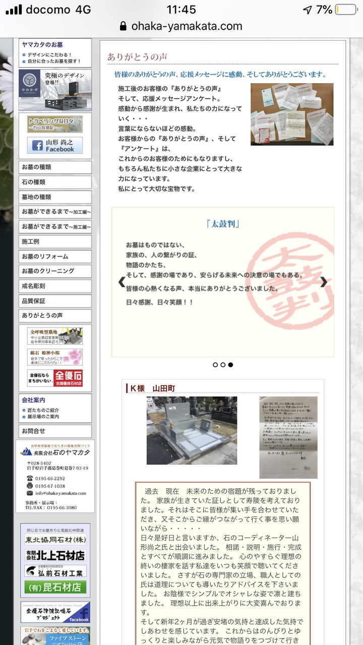 石のヤマカタHP。お客様から頂く熱い『ありがとうの声』に