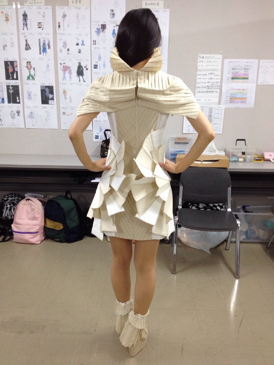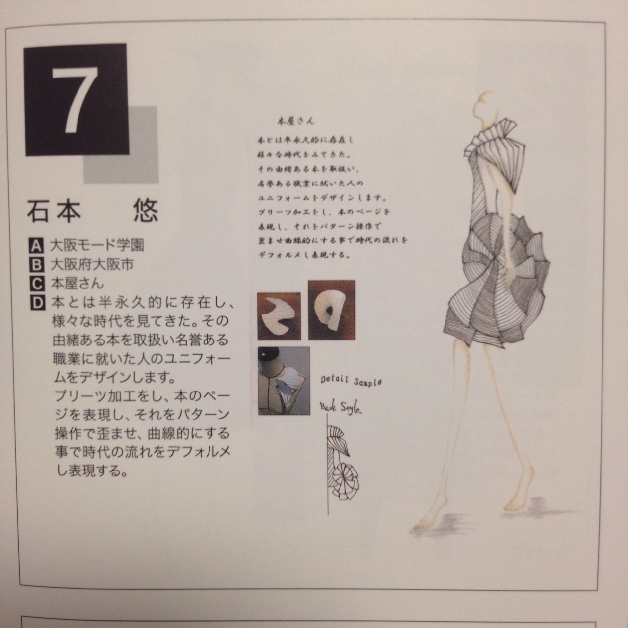 作品説明:本とは半永久的に存在し、様々な時代を見てきた。その由緒ある本を取扱い名誉ある職業に就いた人のユニフォームをデザインします。プリーツ加工をし、本のページを表現し、それをパターン操作で歪ませ、曲線的にする事で時代の流れをデフォルメし表現する