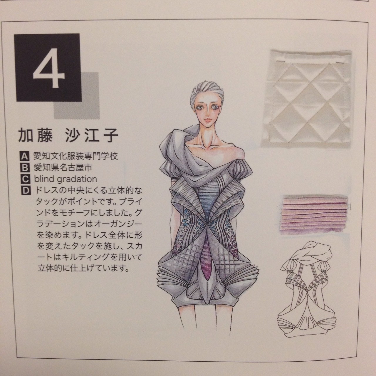 作品説明:ドレスの中央にくる立体的なタックがポイントです。ブラインドをモチーフにしました。グラデーションはオーガンジーを染めます。ドレス全体に形を変えたタックを施し、スカートはキルティングを用いて立体的に仕上げています