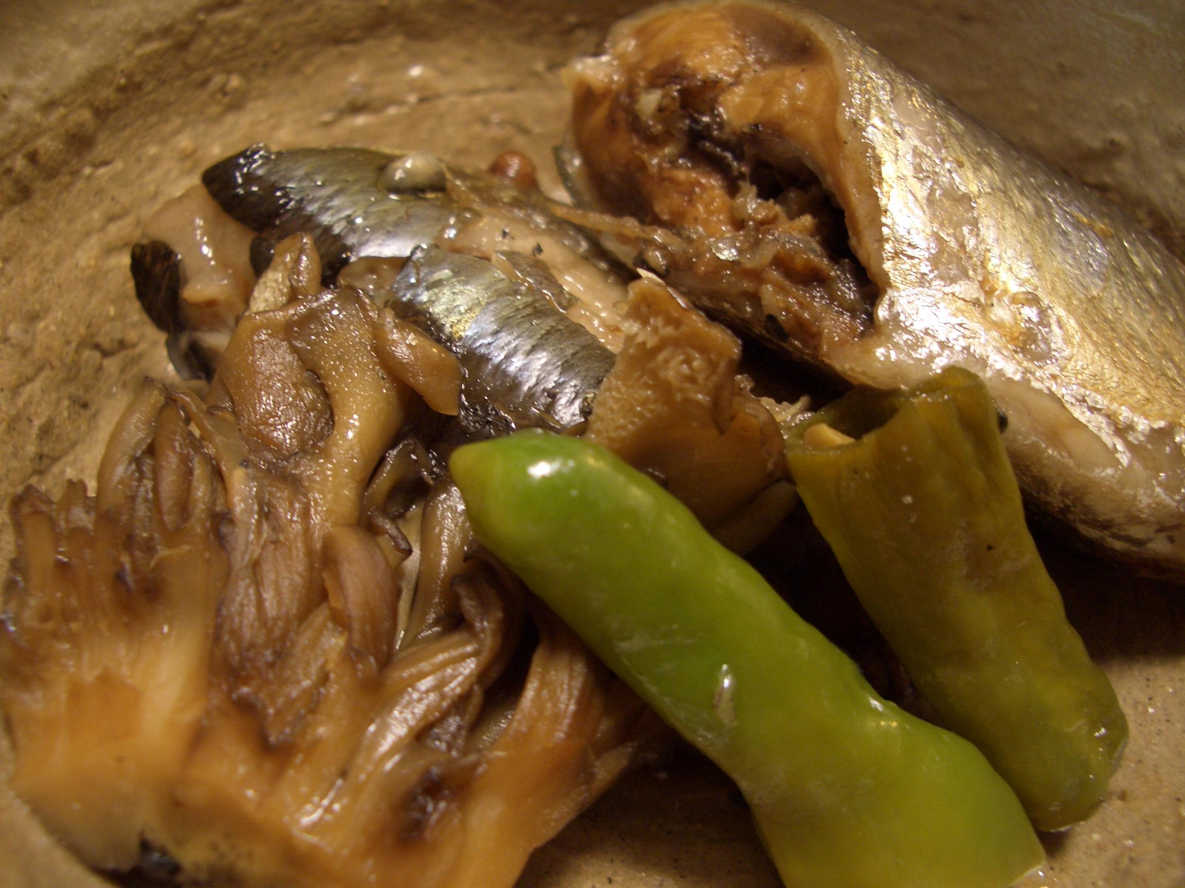 普通に塩焼きにするつもりだったのですが、最近みたレシピに「山椒煮」があったのを思い出して作ってみました。秋刀魚一匹あたり4等分くらいにぶつ切りにします。それをお酒、お醤油、お酢、山椒で煮込みます。冷蔵庫にあった舞茸も入れてみました。