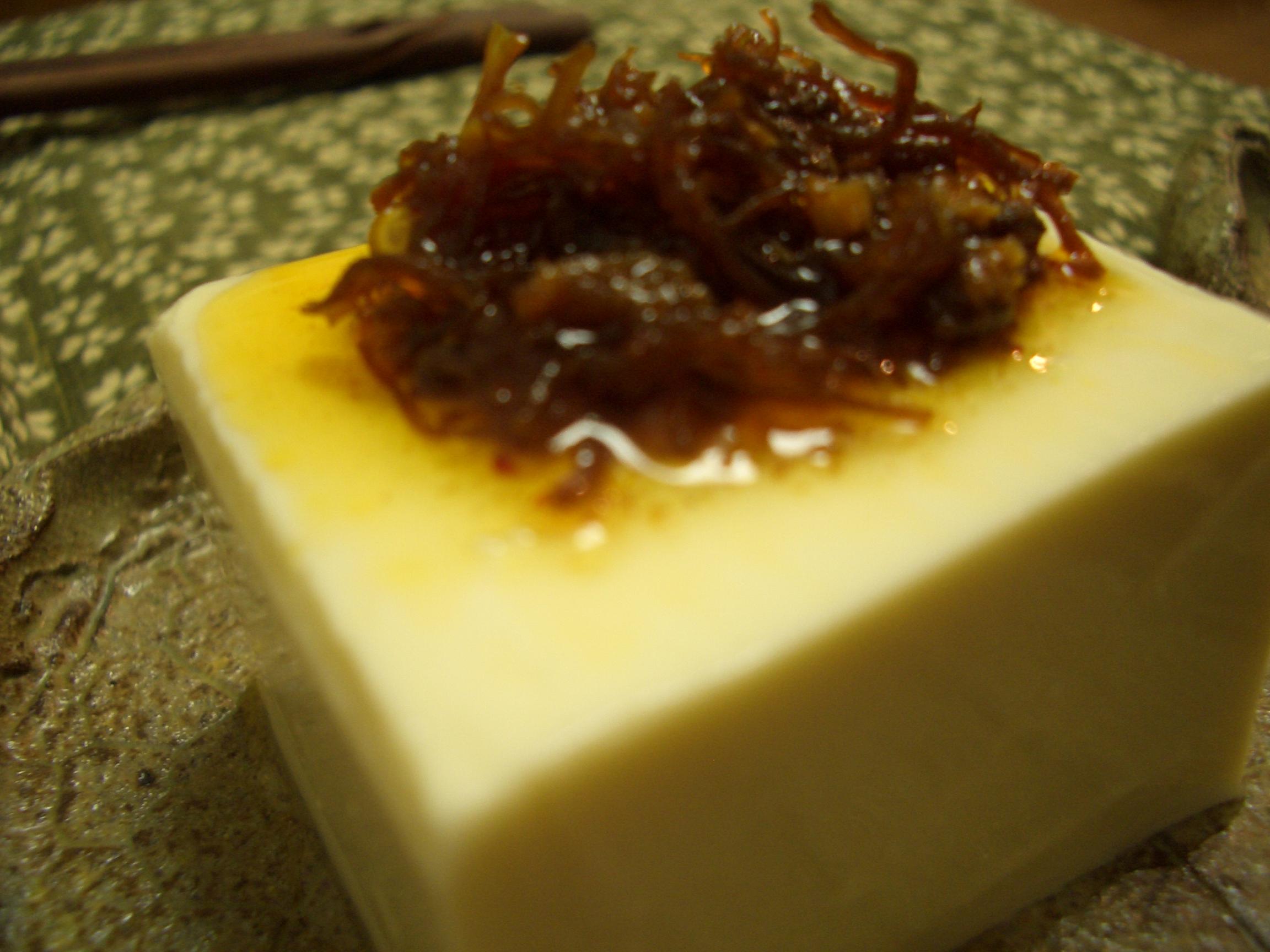お豆腐にXO醤をのせて、ほんの少しお醤油をたらしていただきます。ほーんとに美味しいのです。
