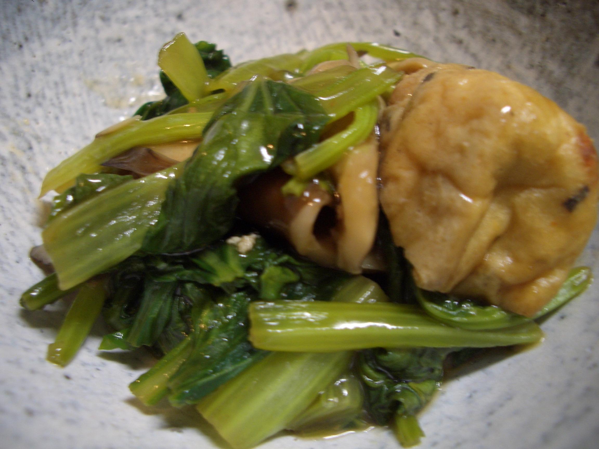小松菜20%引きだったので、少々葉っぱが傷んでいるところはよしとして。。味付けは、豆板醤、オイスターソース、醤油、砂糖少々、鶏がらスープで。最初に、小松菜の茎と舞茸を炒めて、小松菜の葉、丸がんもを入れて、しんなりしてきたら調味料入れて出来上がり。