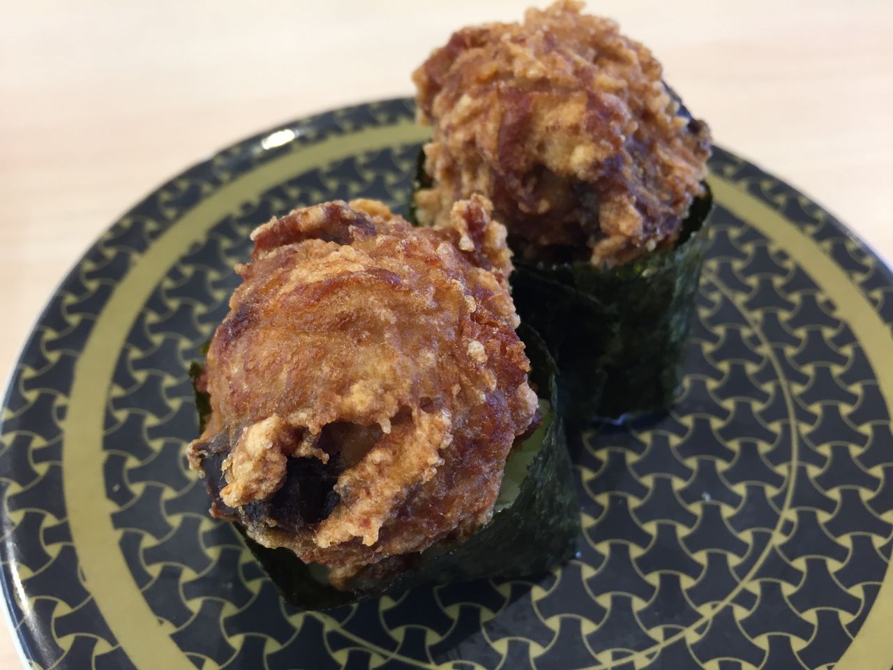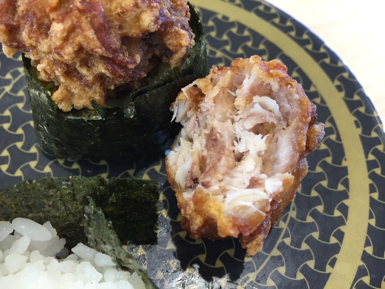 まぐろ竜田揚げ軍艦。揚げ物系を挟むと一気に満腹感が得られます。竜田揚げはボリューム満点のでかさ!