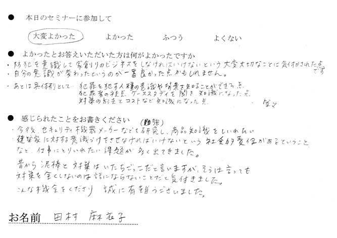 防犯のことだけでなく、セミナーをどのように成功させるかというポイントまで学べた事は大変勉強になりました。
