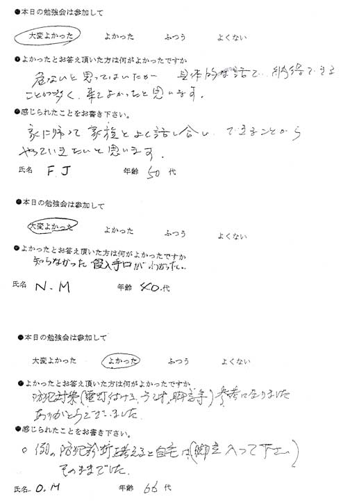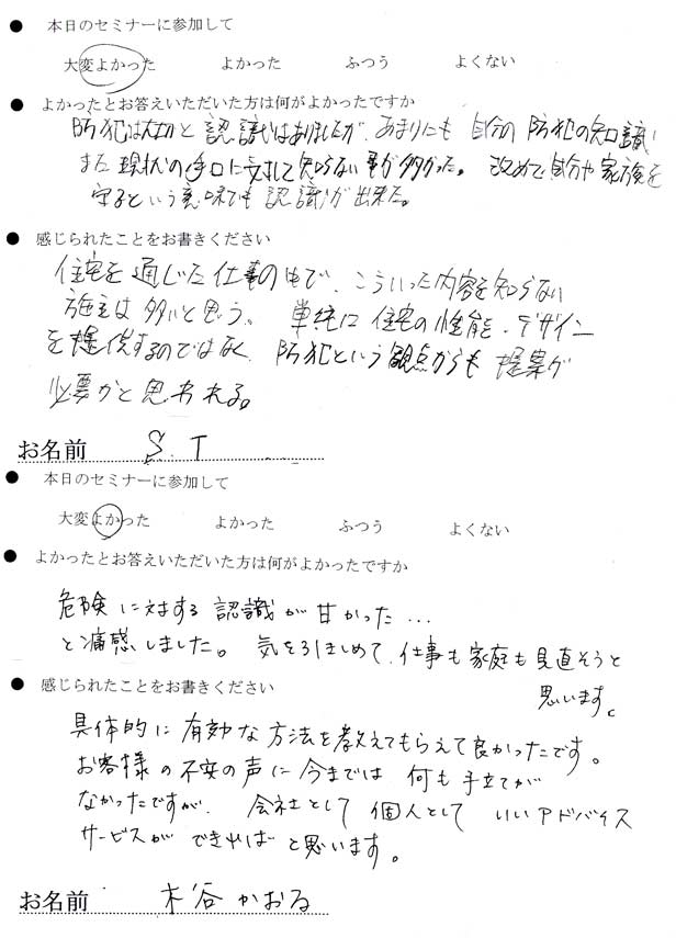 「あっと言う間の3時間でした。初めてお会いした方々ともいろいろお話できて良かったと思います。最近は本当に怖い犯罪が多いので、今日からさらに気を引き締めて家屋の防犯対策をしたいと思いました。わかりやすく丁寧なご説明をありがとうございました。」(K.Sさま)