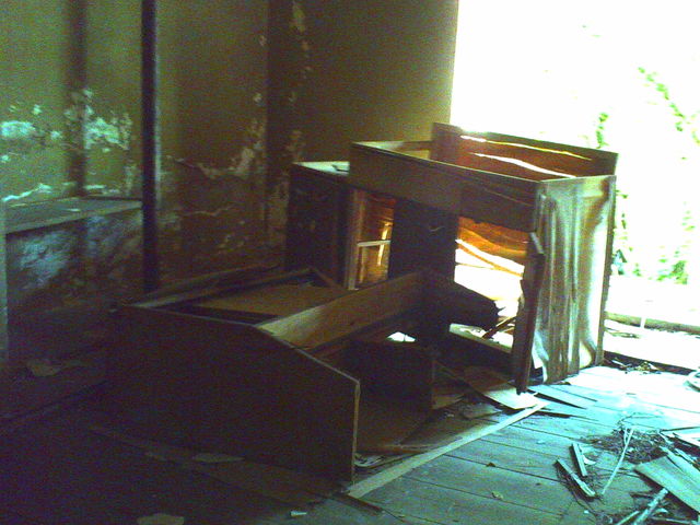 客室。箪笥なのか机なのか。三階まであって、部屋はいくつもあったんだけど、床がひどいから入らずじまい。それになんか怖かった笑。