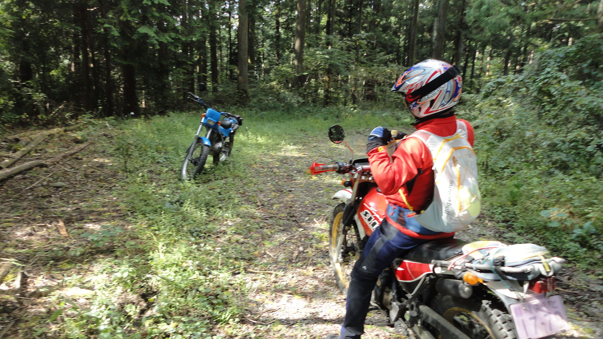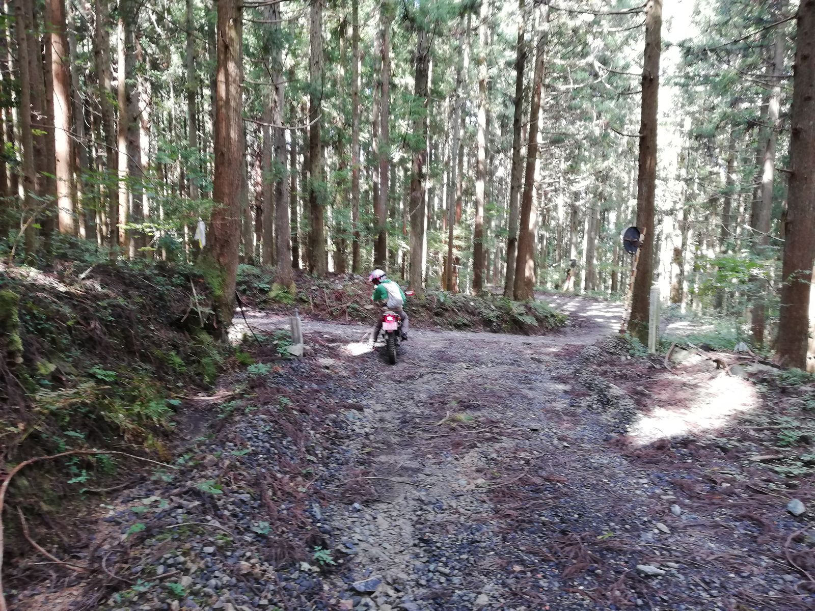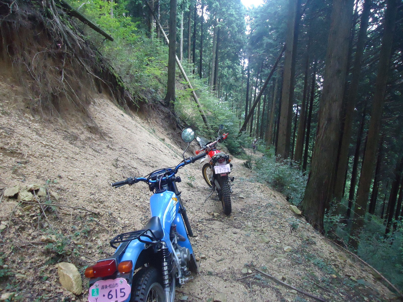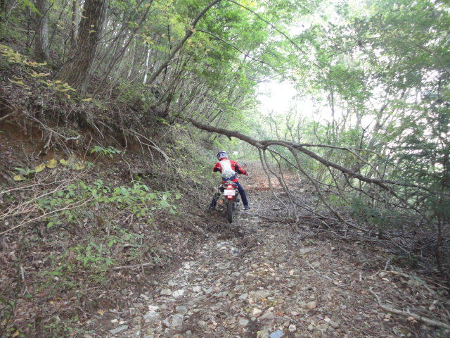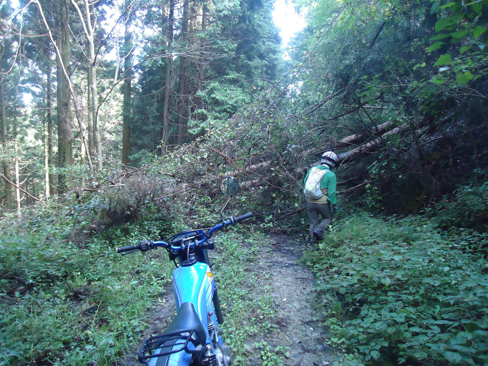 途中、倒木がとうせんぼ。。TL125で、濡れた丸太をひょい!と越えようとしたけど、Fサスを縮めるタイミングとRサスを抜重するタイミングが合わず。足つき3点。情けない。。
