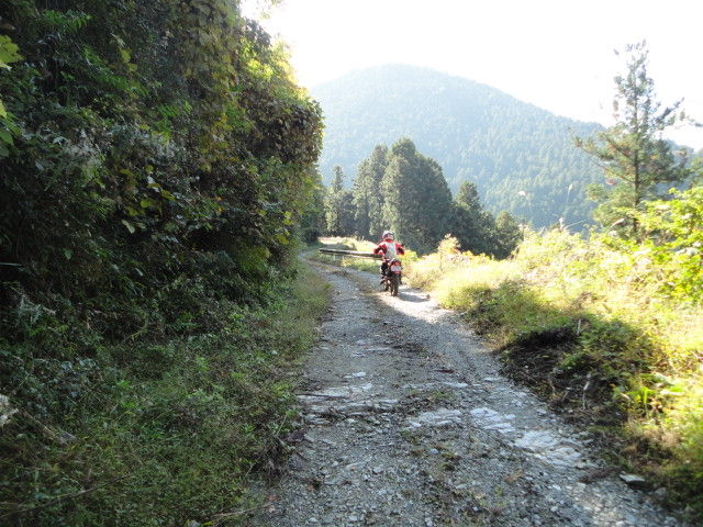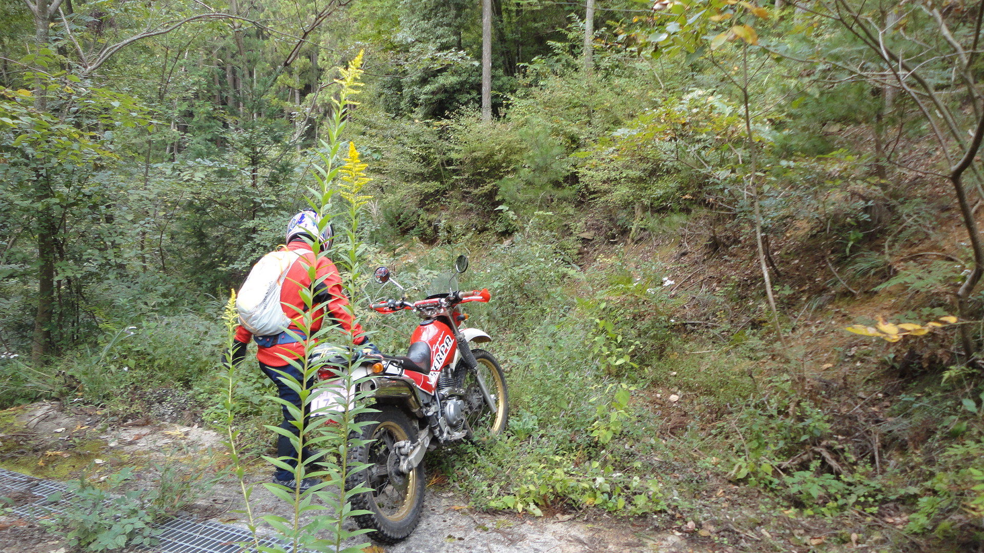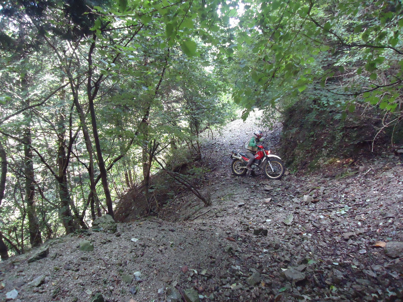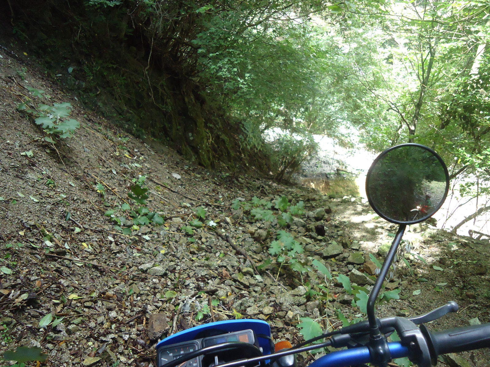 峠を越して?まぁまぁきつい下り。。だんだん、道が狭くなり。。もはや、道ではなくなりました。。バイクを下りて下見。