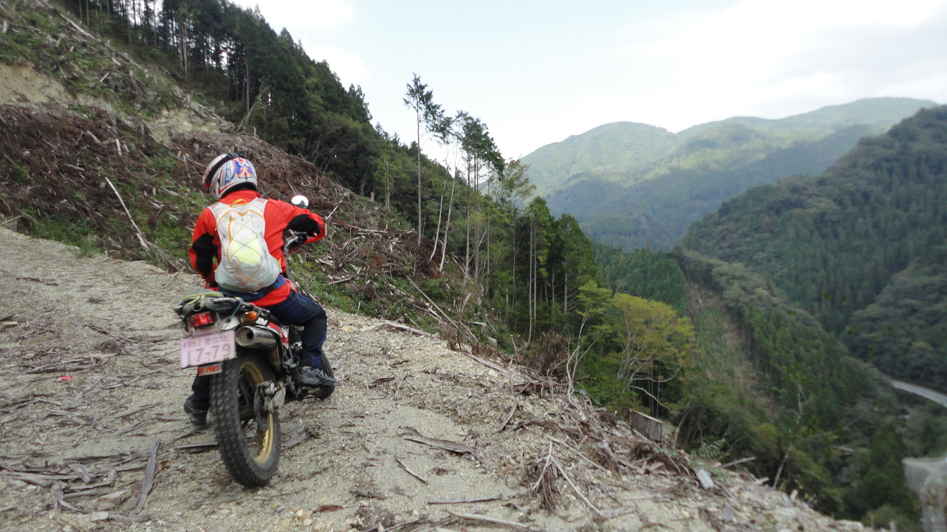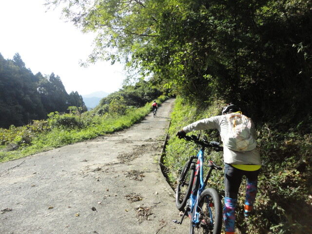荒れた道をラインを選びながらの走行。空気パンパンのラジアルではない固いタイヤなので、タイヤが石の上に乗るとハンドル取られそう。とはいえ、それも、また楽しい。。最後は土砂崩れでした。。残念。引き返し。。