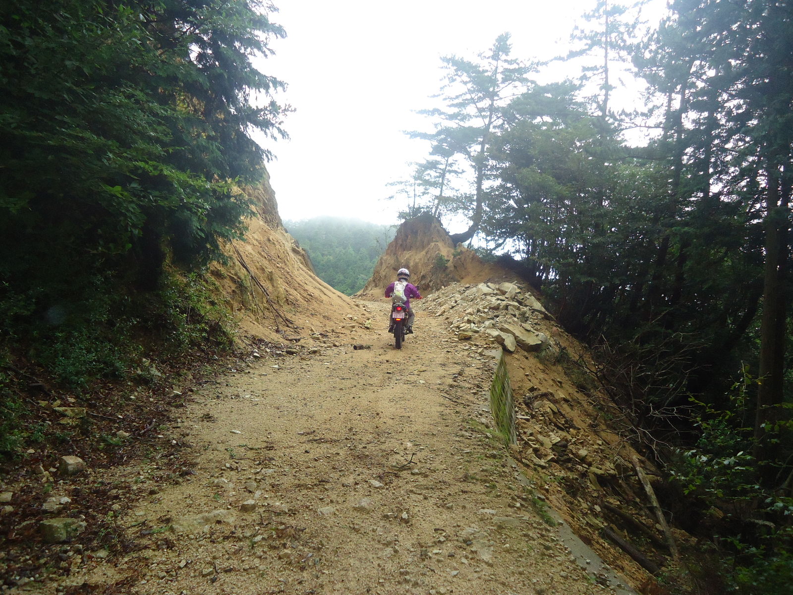 荒れた道をラインを選びながらの走行。空気パンパンのラジアルではない固いタイヤなので、タイヤが石の上に乗るとハンドル取られそう。とはいえ、それも、また楽しい。。最後は土砂崩れでした。。残念。