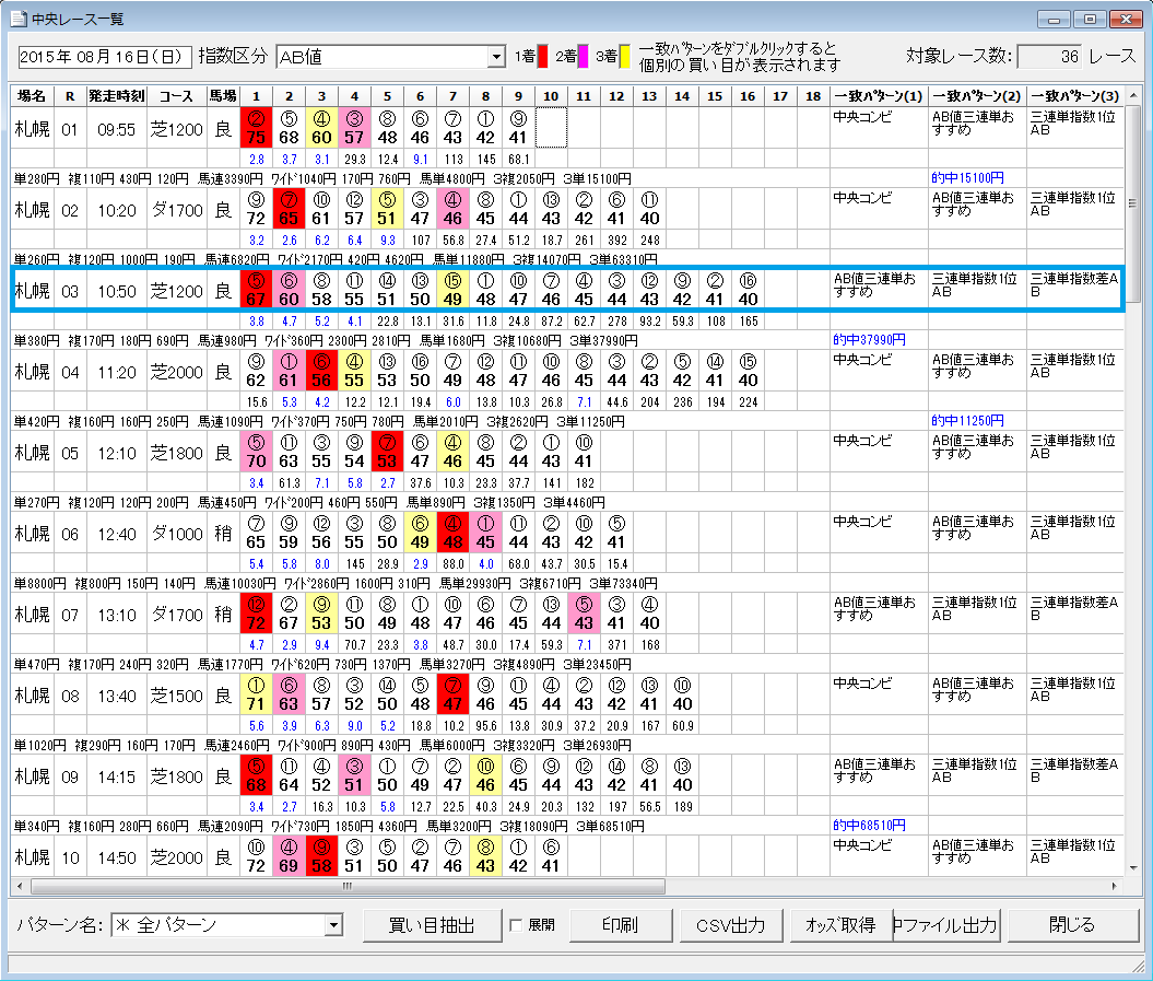 「レース一覧」の「買い目抽出」ボタンを押すと開くことができます。レース一覧の表示一致パターンのあるレース(図の青枠内)をダブルクリックすると対象レースの投票画面が開きます。