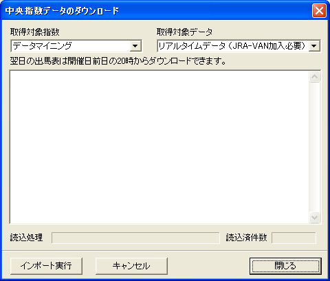 2.取得対象データが「リアルタイムデータ(JRA-VAN加入必要)」になっていることを確認し、「インポート実行」ボタンを押します。