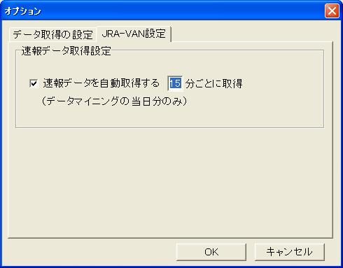 2.オプション画面の[JRA-VAN設定]タブを開き、「速報データを自動取得する」にチェックを入れます。