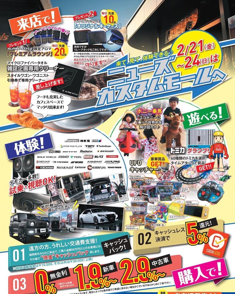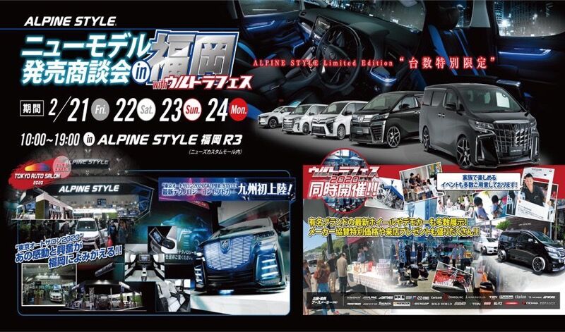 オートサロンの感動を再び!アルパインスタイル@"NEWモデル発表商談会in福岡withウルトラフェス"開催!! 2020年02月20日 15:49 福岡市のニューズカスタムモール敷地内、アルパインスタイル福岡R3にてウルトラフェスが開催!東京オートサロンで話題のアルパインスタイルコンセプトカーが九州初上陸や、当イベントでデビューした新型レオンハルト「アングリフ」「ネクステージNX20M」を展示しています^_^また他社NEWモデルやデモカーも多数展示!無金利やお子様が遊べるイベントも同時開催^_^是非遊びに来てくださ〜い!福岡市東区下原1丁目22番24号TEL 092-663-8185http://www.new-s.co.jp/ 「SALE情報」カテゴリの最新記事 < 前の記事次の記事 > コメント コメントフォーム 名前 コメント 評価する リセット リセット 顔 星 投稿する 情報を記憶