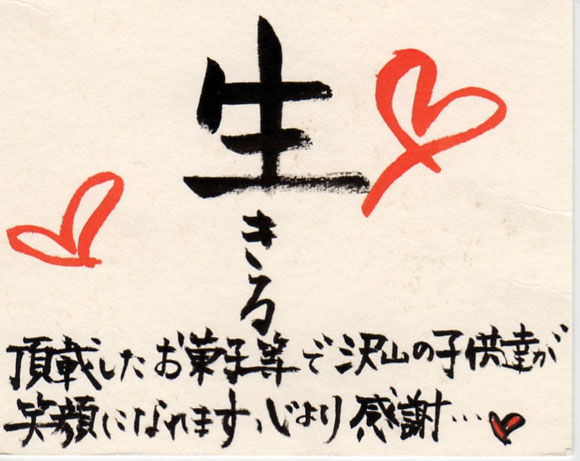 震災の規模は計り知れないほど大きく、それに伴って被災された人たちも多く・・・自分の出来ることってコレっぽっちかもしれない・・・。だけど、わざわざお礼のハガキを送っていただいて・・・胸が熱くなりました。こみ上げるものがありました。 これっぽっちでも、気持ちは繋がってる、自分の出来ることを続けようと思いました。