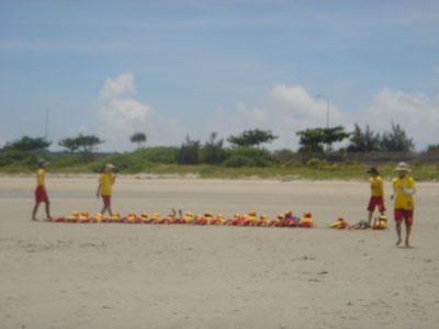 悪天候のため、客足は途絶え、ライフガードにも余裕が出来たので、ジュニアプログラムやイベントのアドバイスをさせてもらいました。海の危険生物の話を実際にしてもらい、子どもへの話し方や進め方など、また興味を引かせたり、子どもに分かり易くする方法を、微力ながらさせていただきました。