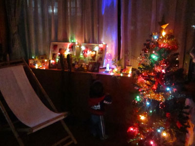 いつもツリーは居間に飾ってあったんだけど、居間は電気が点いていて明るすぎるので、ライトを点けてもイマイチ