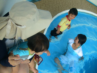 だけど、ももちゃんとプールに入るのは初めてだから、なかなか私の手を離さずにいました。そんな時、ももちゃんに潜ったり、泳いだりしてもらうと・・・「ももちゃん上手!」と言って、すぐに私の手を離し、ももちゃんに「抱っこ」「あっち行こう〜」って。