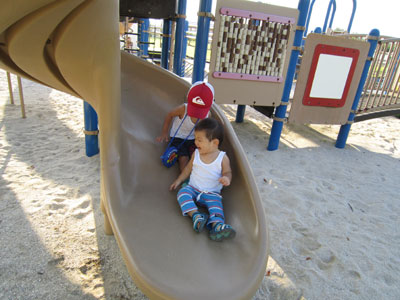 次男も、なんとかそれなりに公園で遊べるようになって、楽しさを共感できるのか、長男も嬉しそうでした。次男は、写真↑右のローラータイプの滑り台がかなり気に入ったみたいで、「もう一回」「もう一回」と何度もおねだり(しゃべらないけど、意思表示)