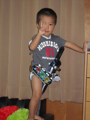 ヒーローものが大大大好きなので、最近始まった「仮面ライダーオーズ」のおもちゃを。「大きくなったら、何になりますか?」という質問に、ビデオカメラに向かって『「仮面ライダーオーズ!!!!』と気合入れて答えてくれました。