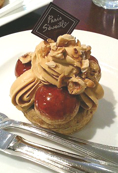 【サントノーレショコラ】こちらに使用されているショコラクリームは少しミルキーですが甘ったるくない、角が取れたしっかり味のショコラです。中にピスタチオクリームと少量のフランボワーズを使用しています。アルノーさんは完熟のフランボワーズを使用しているのでしょうか?酸味がとんがらず香りが際立っています。ピスタチオは殆ど分かりませんがクリームのコクはナッツによるものかもしれません。『パティスリー・パリセヴェイユ』のガトーはもちろん好きなのですがイマイチ完成度というか何を狙いにして素材を組み合わせているのか分からない感じが有ったのですがアルノーさんの手が加わる?ことによって数段上の