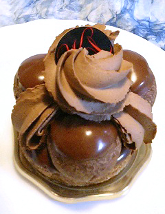かねてより気になっていた噂の【ショコラカエール】(アルノーラエール&金子美明)を頂きました!学生時代はマ・パティスリーに日参できる環境にありましたが今はそうも行かず・・・【待て】を命令された犬の様な気分でした。早速ショーケースを見てみると・・・見事にショコラで一色です。しかも『パティスリー・パリセヴェイユ』のガトーに見た目がそっくり!一応一通りの商品に目を通し、店員さんに話を伺いますが・・・どうも要領を得ません(不満)。思案の末に選んだのは以下の3点プラスガトー2点(母と半分こにしました)、+ヌガティーヌとトリュフでした。