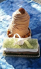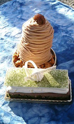 京橋のイデミ・スギノに生ガトーの新作をチェックしに行ったのですが、某テレビ番組で紹介されてしまった為連日お客さんで大賑わいだそうです・・・その影響で・・・ガトーは全く無し!開店前から行列ができており、 9:00までに100人は並んでいたそうです.こんな事なら1月中に一度イートインしておくのでした.悔しい!そこでちかばのこちらでガトー2種キャラメルモンブランと抹茶のガトー(名前失
