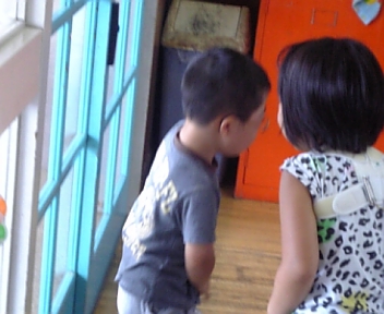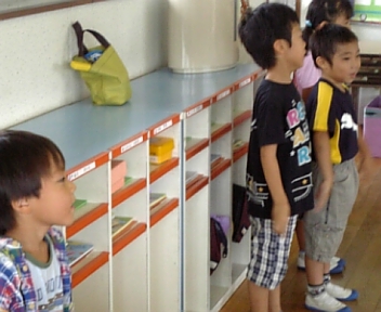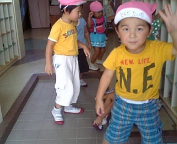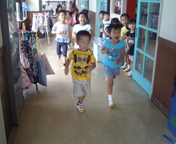 廊下で待っているお誕生児達の前を