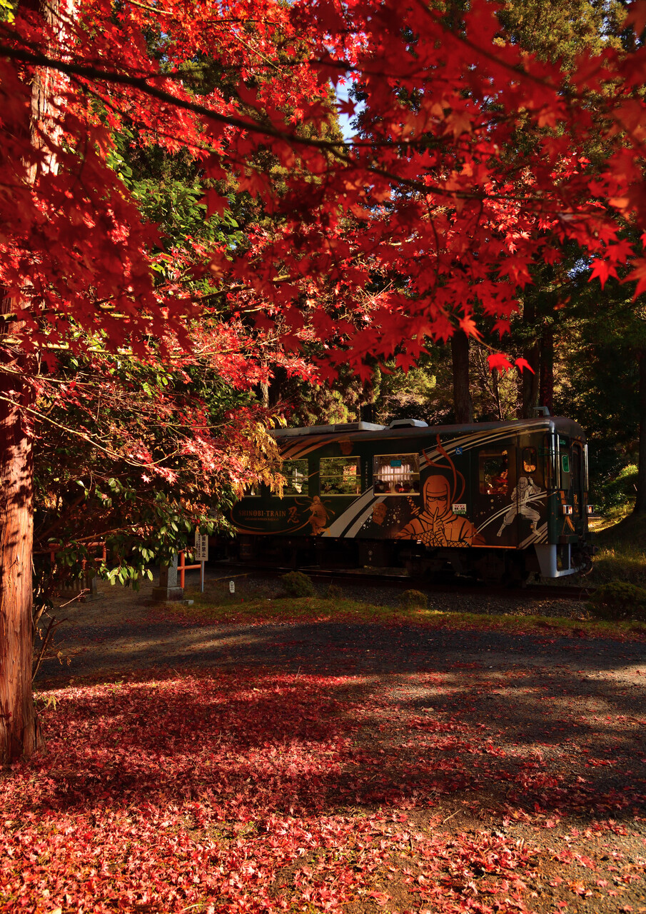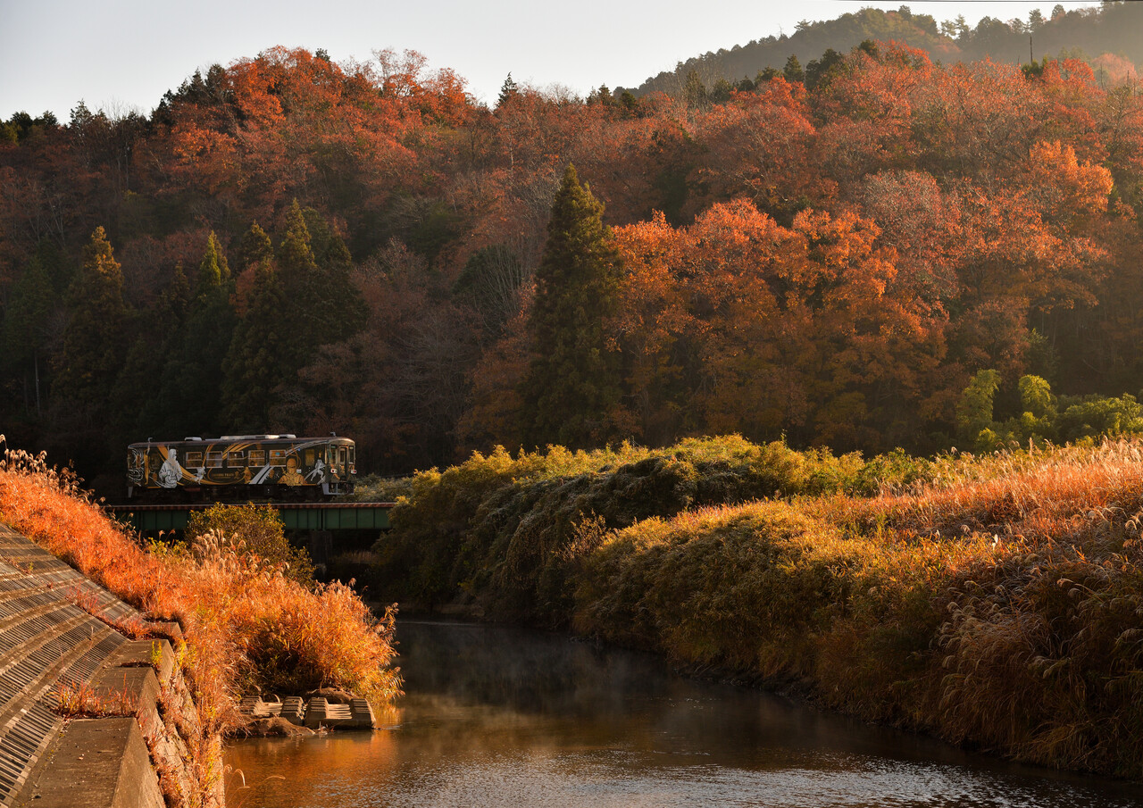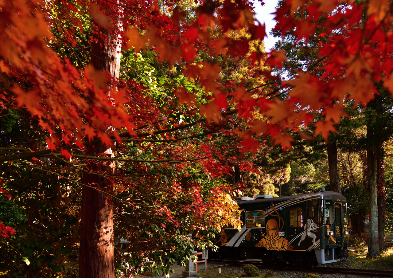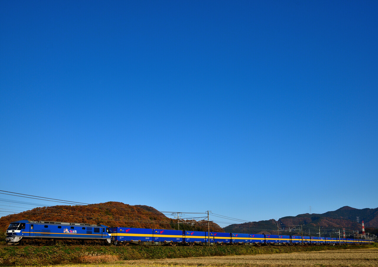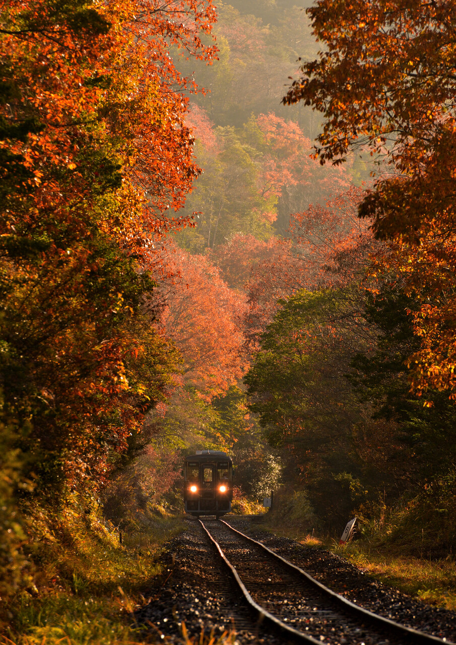早朝の下りは色付いた山と秋らしい空をバックに撮ってみました。