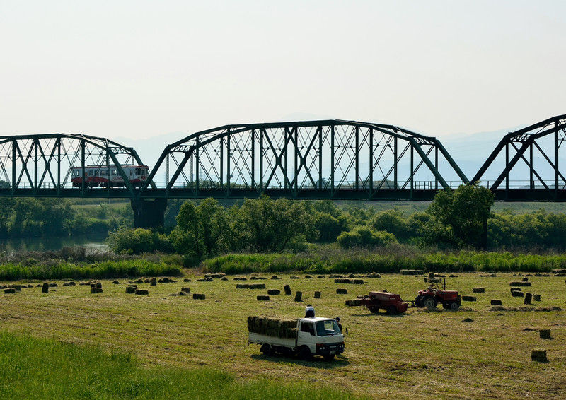丁度、牧草の刈取りをされていました。構図ばかりが気になって、SSが新幹線を撮っていた時のまま・・・。(汗