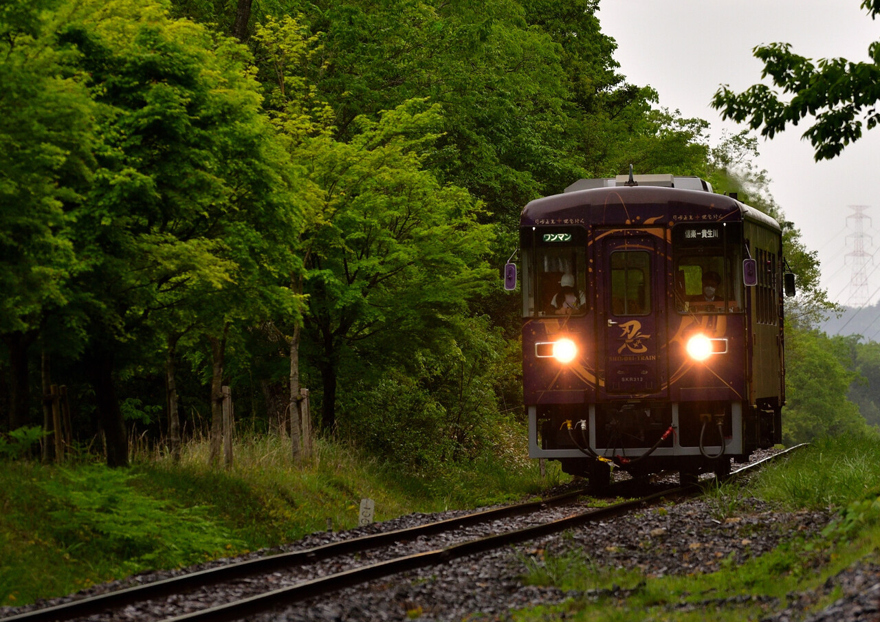 2024年05月30日 信楽高原鐵道と新緑② 今年はこちら側もいい状態で・・・。5月6日 1/400 f/5.6 ISO-200 貴生川~紫香楽宮跡間二両編成の後ろが緑だったのでいい感じでした。今にも雨が降り出しそうでしたが、折り返しを撮ろうと待っていると・・・。5月6日 1/400 f/5.6 ISO-250 紫香楽宮跡~貴生川間雨の中やってきたのは『忍トレイン』でした。この日の走行は無いと思っていただけに、これはこれで良かったかと・・・。収まりのいい一枚になってくれたかと思います。