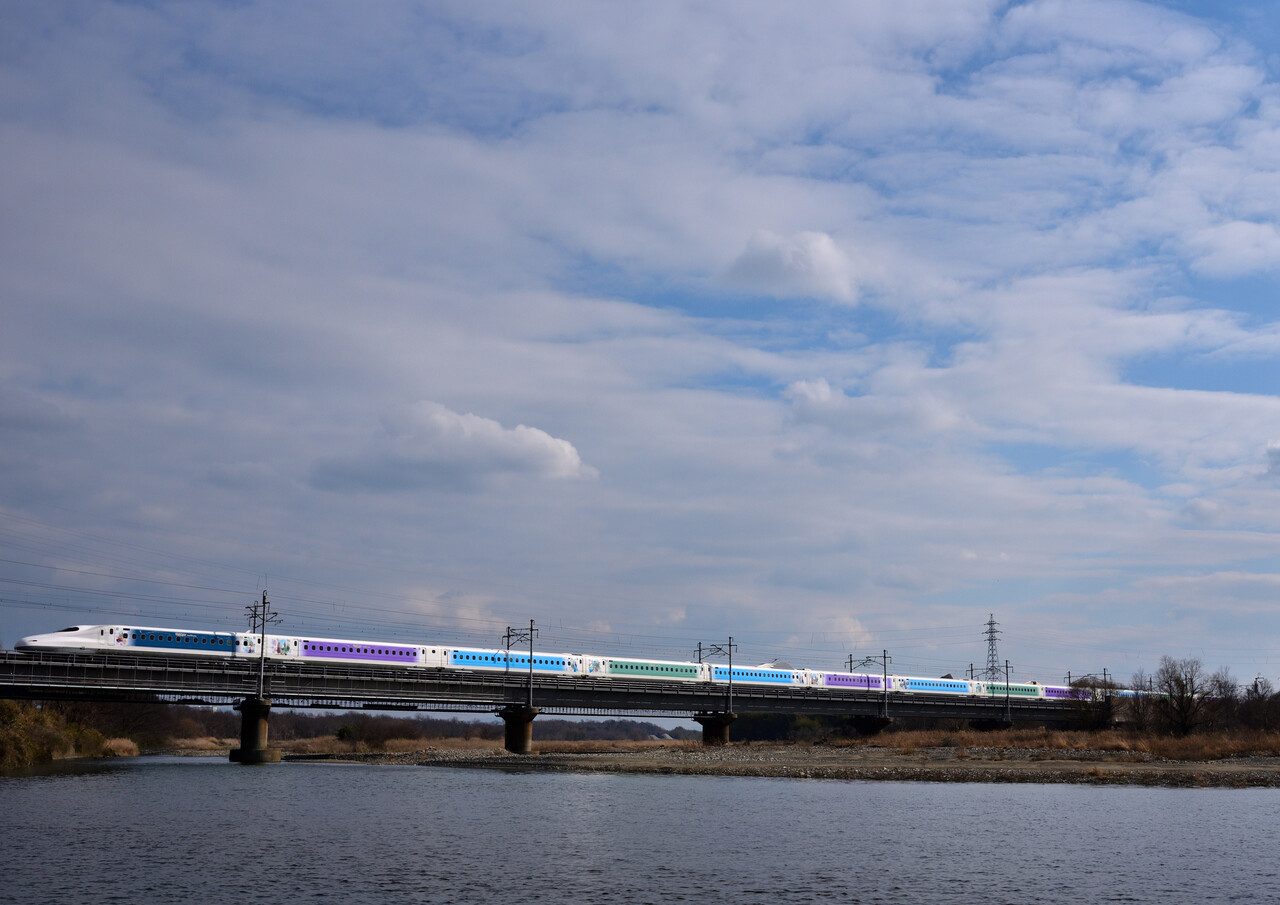 2025年03月22日 Wonderful Dreams Shinkansen:3/20③ 走行期間が限られているのでなるべく色々な所で撮っておこうと・・・。この日の3本目は愛知川橋梁へ・・・。3月20日 1/2000 f/8 ISO-140 京都~米原間橋梁工事中で少し前までシ-トが掛かっていたりもしていましたが、この日はスッキリした感じで水辺から撮ってみました。ここでも現着時はドン曇りでしたが、通過直前に青空が見え始め、日差しも・・・。雲多めでしたがなかなかいい感じになったかと思います。