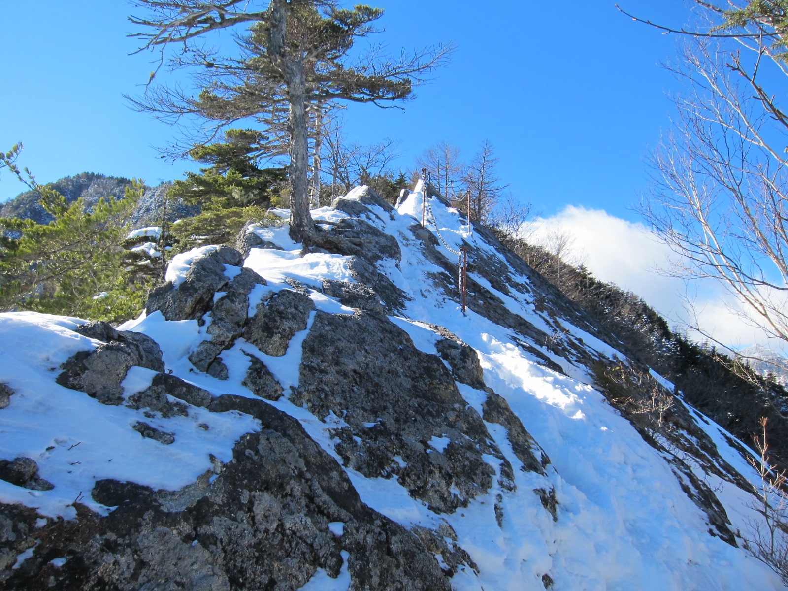 ここから左方向に移動し、急斜面の鎖場が続く。