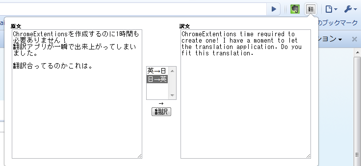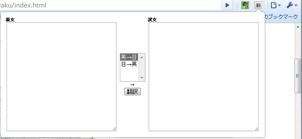 画面はpopupを利用します。そこに画面を出します。内容は簡単です。原文と訳文、翻訳の選択、翻訳実行ボタンを配置して完成。