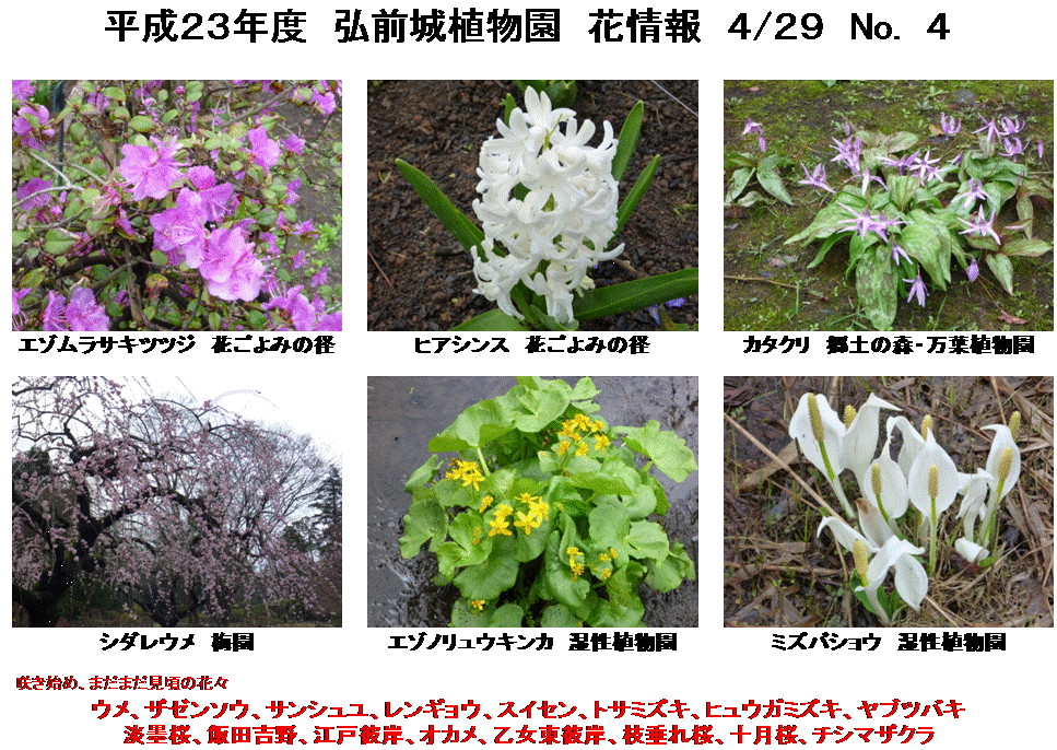 2011年04月29日 平成23年度 弘前城植物園 花情報 No. 4 弘前公園のソメイヨシノも開花し、公園内が賑やかになって来ました。弘前城植物園の早咲きの桜は、満開の品種もありますよ。(⌒-⌒) 今年度、弘前城植物園内にも「たか丸くん」が登場しました。花時計の前に“立って”いますので、来園の際には記念写真でもいかがでしょうか? 弘前城植物園は5月5日(木)まで18:00(最終入園時間17:30)まで開園しております。 では、今週の花情報です。 ↓Instagramやってます↓