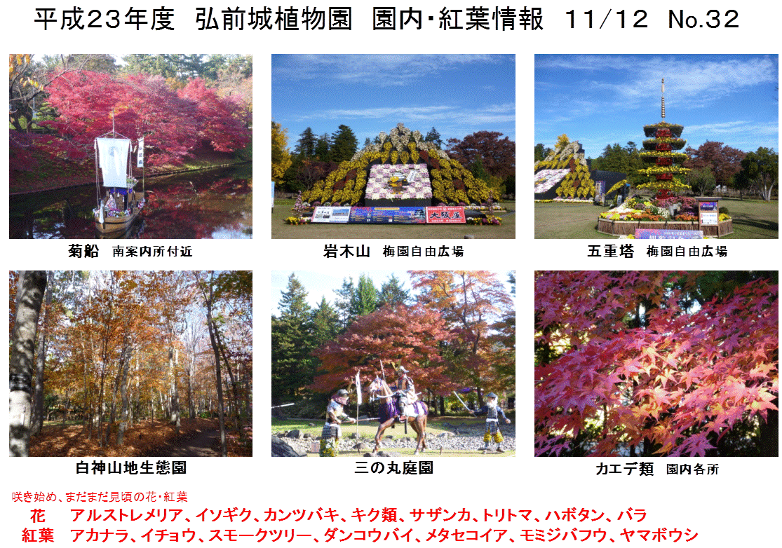 2011年11月12日 平成23年度 弘前城植物園 園内・紅葉情報 No.32 弘前城菊と紅葉まつり好評開催中!!! 弘前公園内では、21:00まで紅葉がライトアップされてますよ。 9日〜12日の間は、弘前城天守(日没〜21:00)、辰巳櫓(日没〜19:00)で、デジタル掛け軸が実施中…ということは…本日デジタル掛け軸最終日!! 観るなら今日しかない!!!!! この期間、弘前城植物園を17:00〜19:00の2時間無料で開放中!! 園内からは辰巳櫓のデジタル掛け軸が観れ、出店もあるので、「観てよし、食べてよし、遊んでよし」などなど……いろいろな楽しみ方があると思いますよ(⌒-⌒) 今週の「園内・紅葉情報」です。 ↓Instagramやってます↓