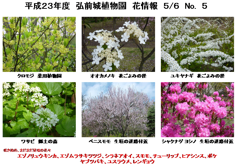 2011年05月06日 平成23年度 弘前城植物園 花情報 No. 5 弘前公園のソメイヨシノ、ヤエベニシダレが満開になり、もう少しでソメイヨシノ、ヤエベニシダレの桜吹雪が楽しめそうです。 弘前城植物園内のソメイヨシノ、ヤエベニシダレも満開!! これから見頃を迎える桜は、横浜緋桜、思川、佐野桜………などなど。 花の色が黄緑色っぽいウコン、ギョイコウは開花までもう少しかかりそうです。 弘前城植物園は、本日より開園時間が通常に戻り 9:00〜17:00(最終入園時間16:30) となります。 ↓Instagramやってます↓