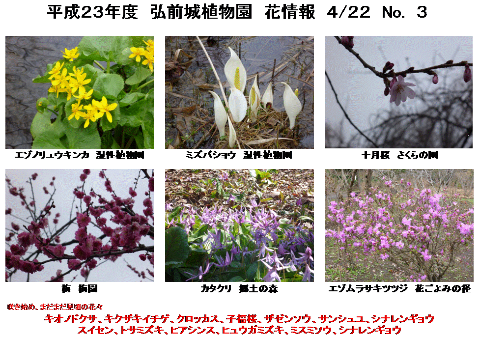 2011年04月22日 平成23年度 弘前城植物園 花情報 No. 3 明日から弘前さくらまつりが開催されます。 弘前城植物園では、さくらまつり期間中の開園時間を1時間延長し、18:00までの開園とさせて頂きます。 開園時間延長期間 4月23日(土)〜5月5日(日) 開園時間 9:00〜18:00 (最終入園時間は17:30とさせて頂きます。) ちなみに、弘前城植物園内の十月桜、子福桜は一足早く開花しました。 ↓Instagramやってます↓