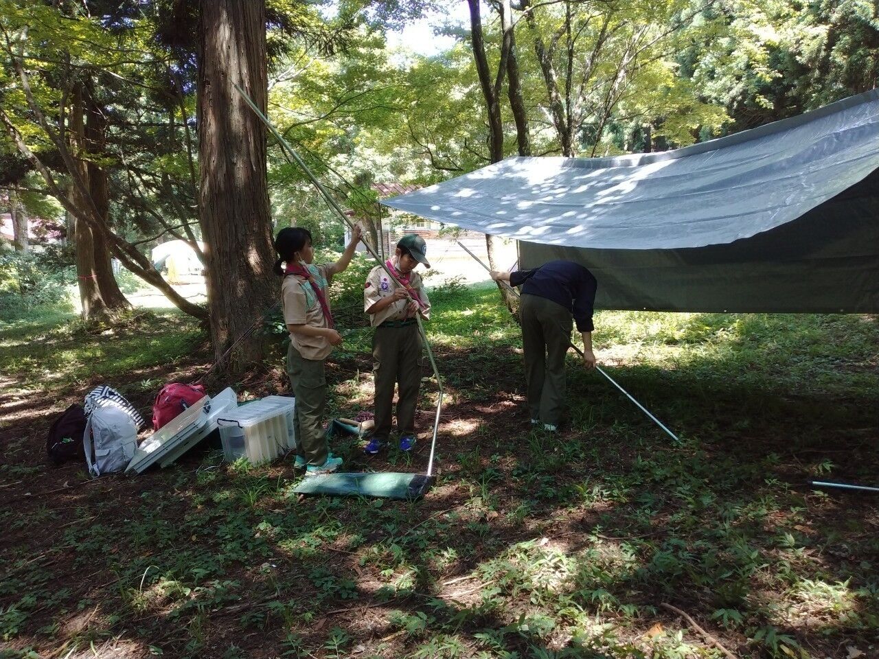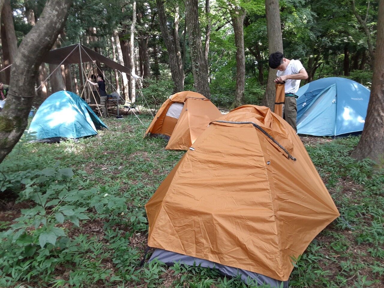場所が決まったら食堂フライの設営、テントの設営に資材整理、やることは沢山あります。