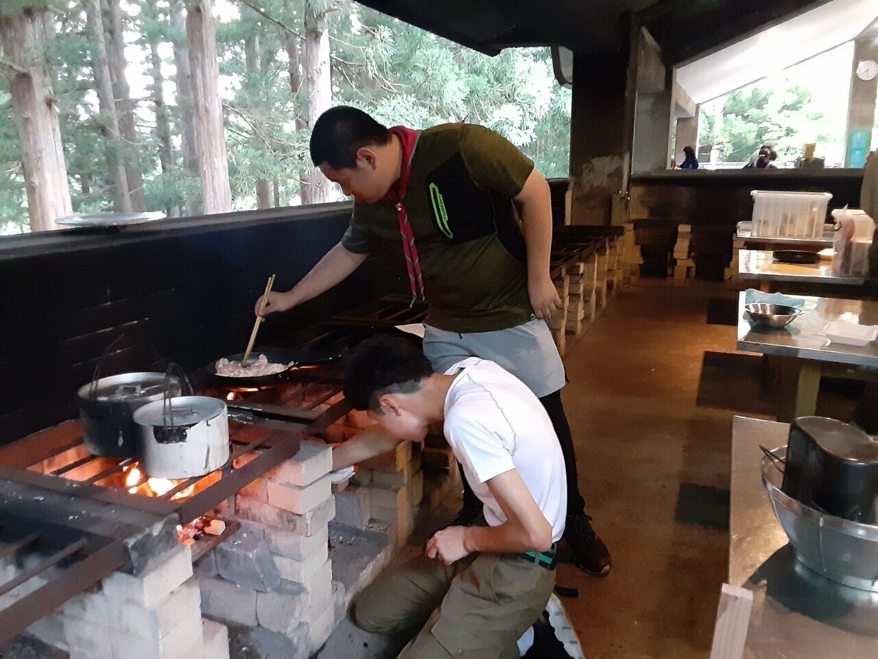 初日夕食は炊事場のかまどで、火起こしは慣れたものですね!