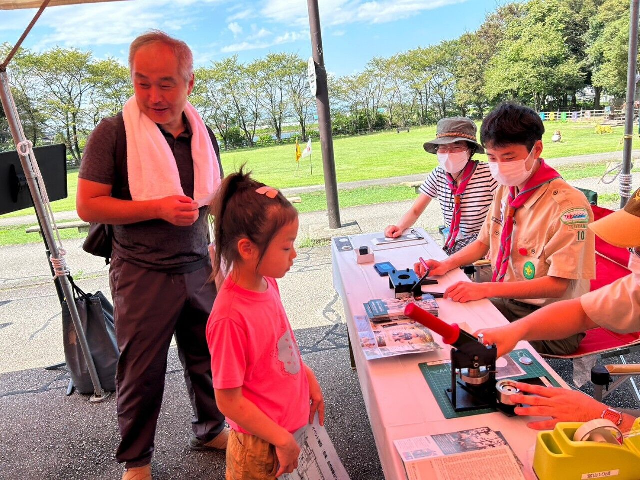 10団ボーイ隊クマ班もスタンプカードを持って参加、早速缶バッジに挑戦