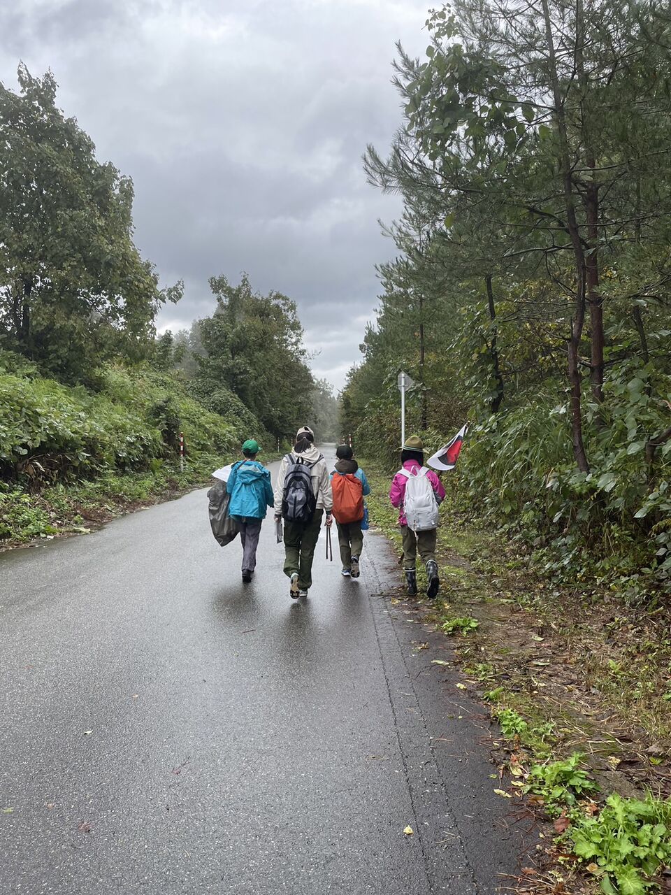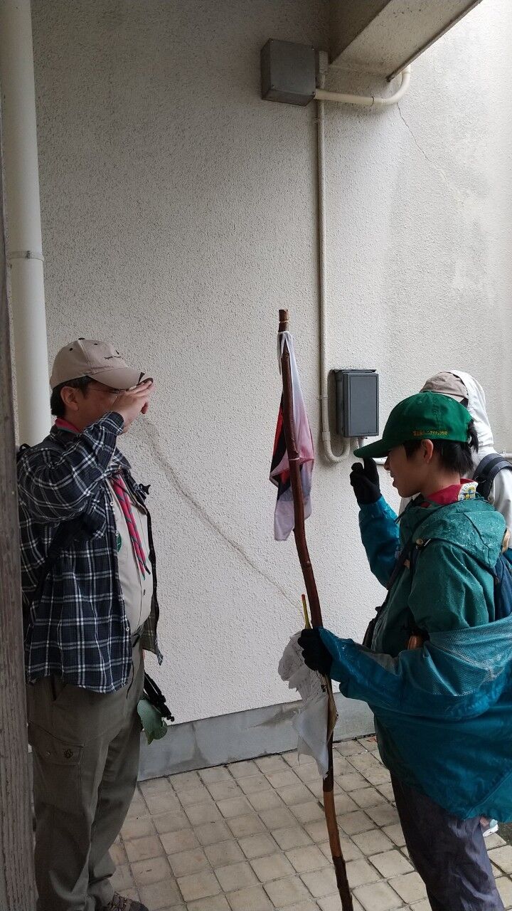 ベンチャースカウトの支援を受けながら、初級スカウト達は冷たい雨の中14キロのハイキングに挑戦しました。