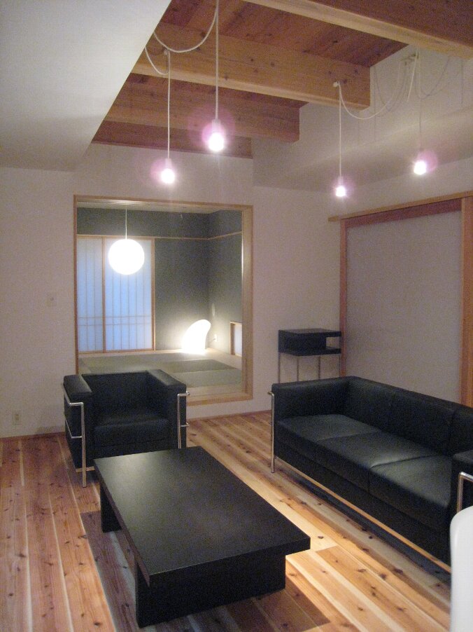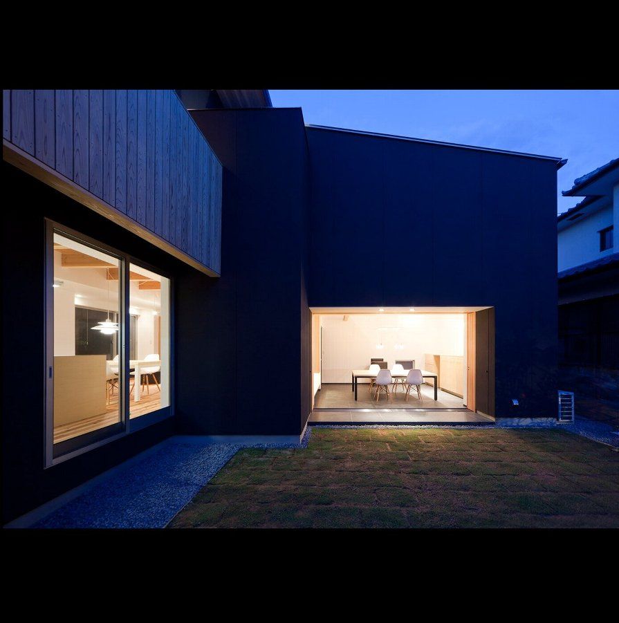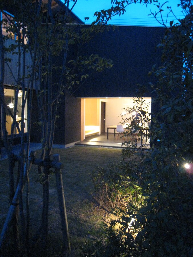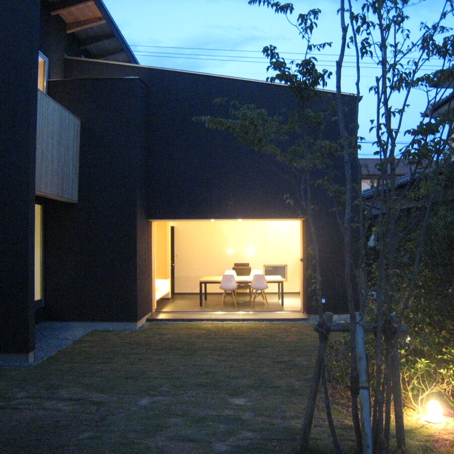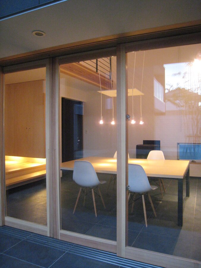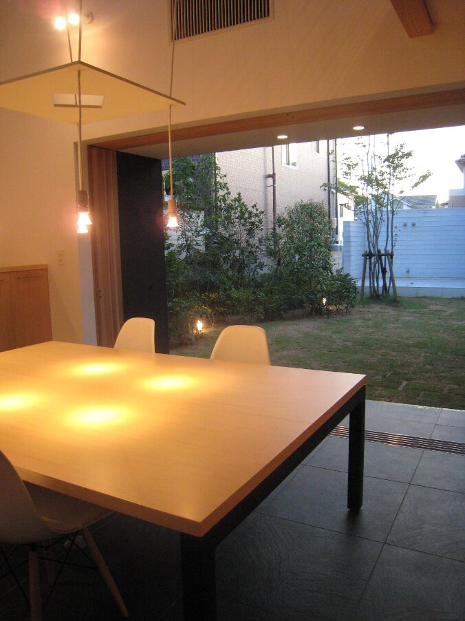 夜の土間ラウンジ、建具を全開放。絵になりますね。